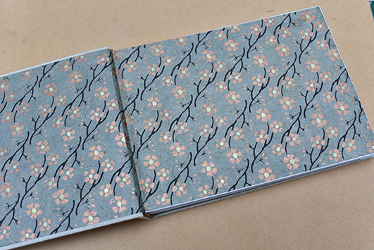 69pp. 204 x 274mm. Hardback open-spine binding with hand-coloured threads, with Chiyogami endpapers and foldouts. Acetate cover.