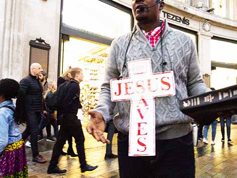 No Sex in Heaven is a photobook produced on London's Oxford Street, the city's major shopping axis, weaving together three thematic strands: mass consumerism, religious evangelism and street homelessness. Deploying both imagery and texts, the book explores the juxtaposition of affluence and poverty, street performance, political protest and campaigning on London's streets.